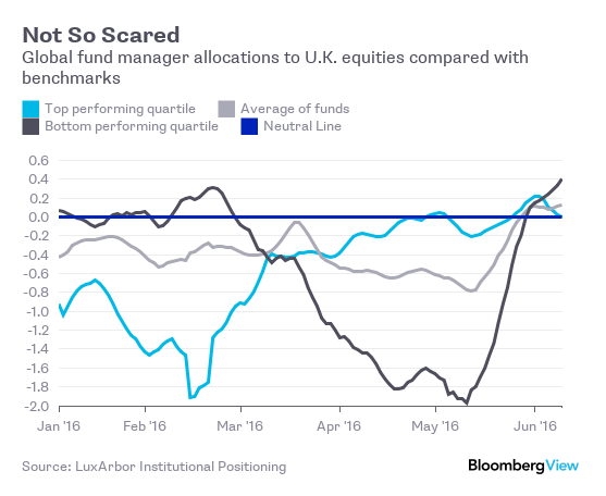 Now, it might be that investors are confident that Brits will vote to stay in the EU. “A `stay' result would reduce uncertainty and bring back business confidence, which would be positive for UK stocks,” LuxArbor said in a press release Friday. But it might also be the case that fund managers are also unfazed by the prospect of an exit. Why?