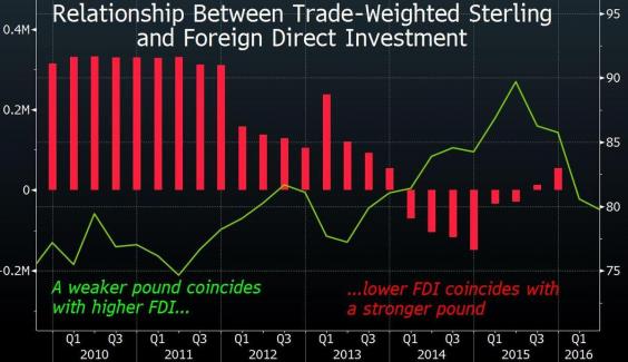 And comparing Deutsche Bank figures on the pound's trade-weighted value with investment flow data from the Office for National Statistics suggests that a weaker pound tends to accelerate foreign direct investment: