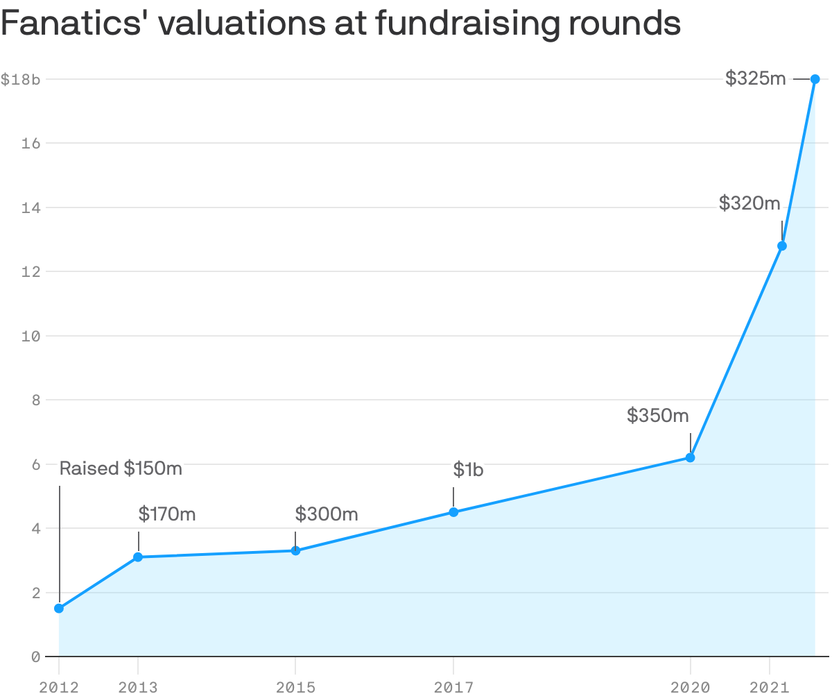 Driving the news: Fanatics closed a $325 million funding round last week that values the company at $18 billion, making it the world's 12th-most valuable private company, per CB Insights.
