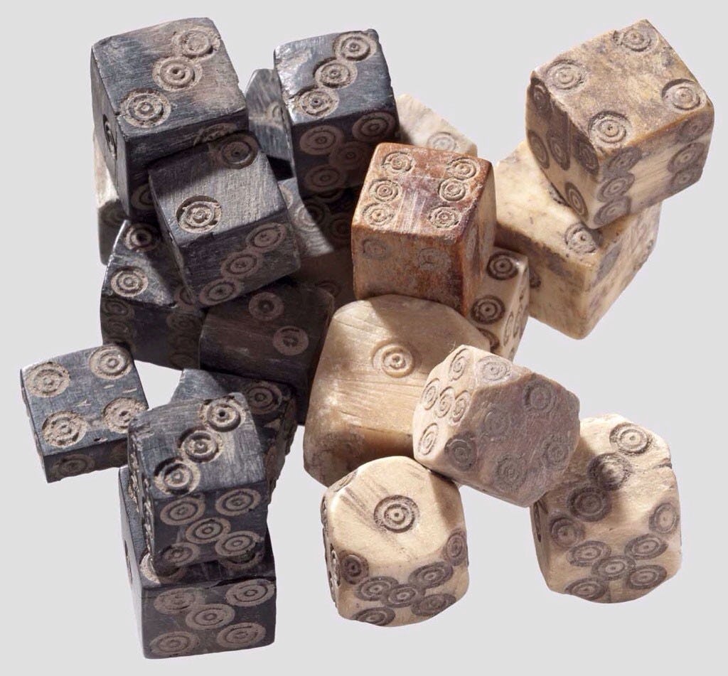 The origins — The first signs of dice can be traced back to the fertile crescent, modern-day Syria, Iraq, and Turkey, around 5000 BC. Unlike the plastic dice we're accustomed to today, these dice were carved from knucklebones, wood, turtle shells or made from painted stones. While some are more irregular in size, some have the tell-tale square shape and numbered markings that you'd still see rolling across any Catan board today.