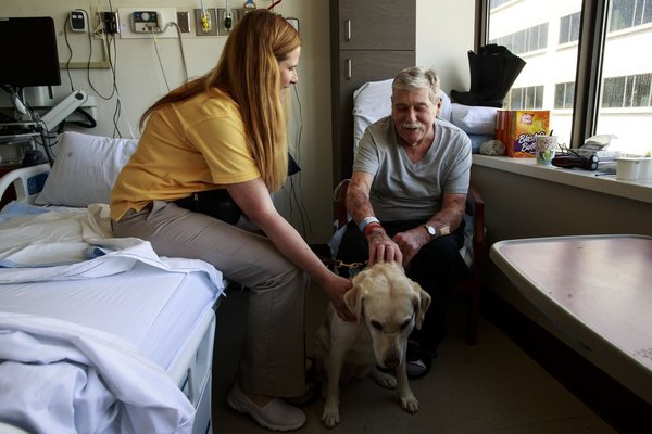 "If she didn't come, I'd want to know why," said Thorgeson, leaning so far forward in the chair beside his hospital bed to pet the dog that he set off an alarm. Viansa moved in closer so Thorgeson didn't have to reach so far. Keenan slipped the man dog treats so Thorgeson could reward Viansa for sitting and shaking hands.