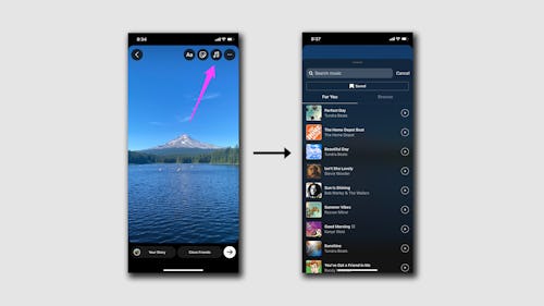 First, when you go to post a story, whether you’re pulling a photo from your phone’s library or taking a video through Instagram, just tap the musical note icon in the top right corner of the screen to pull up Instagram’s music center.