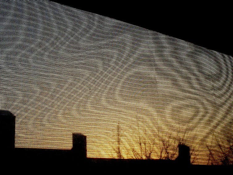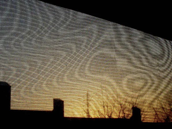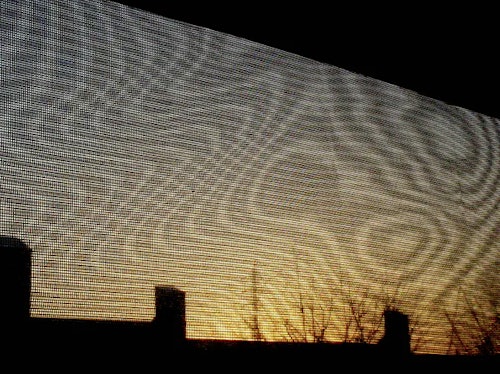Placing an insect screen and a net curtain outside a window, for example, will generate moiré patterns that change as the wind varies. This works even on overcast days, but in direct sun the moiré patterns are also cast as moving shadows on interior surfaces.