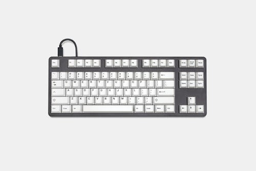 Continuing the vintage theme from the white and beige NK87, Drop’s white-on-black Artifact Bloom keycaps are a set of Cherry-profile keycaps reminiscent of classic office keyboards with a more minimalist monochrome color scheme. The font is Helvetica-esque like the ones used on OEM Cherry keyboards; the Cherry-style profile is familiar and comfortable to type on.
