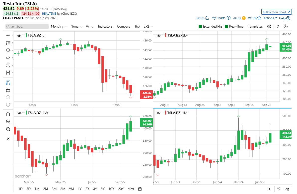 Example: Perform a top-down analysis and compare Tesla (TSLA) on a 5-minute chart, daily chart, and weekly chart — all in one dashboard.