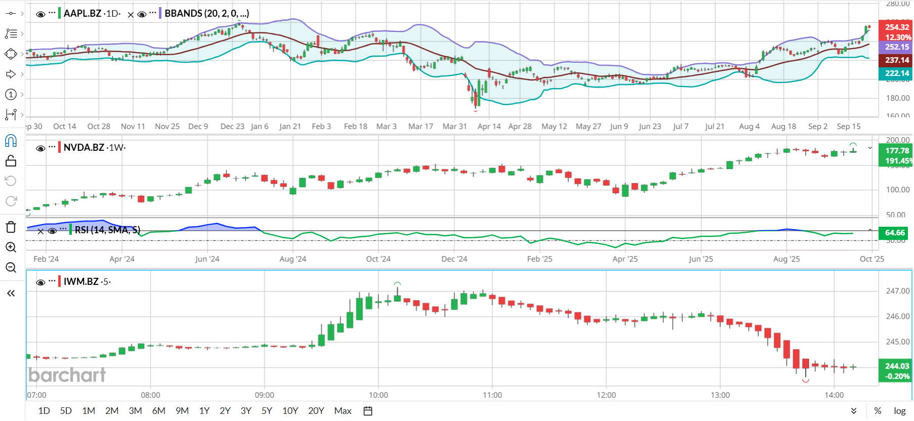 - Pane 1 → Apple (AAPL) daily chart with Bollinger Bands