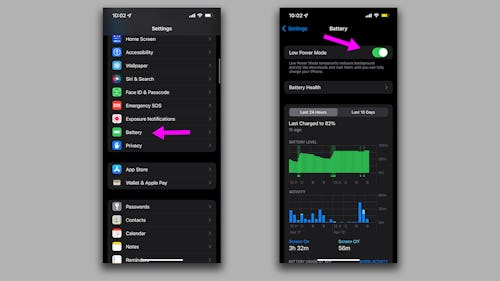 To turn on Low Power Mode, open up your Settings app and find the “Battery” menu. The Low Power Mode toggle is at the very top of the menu. If you really want to watch your battery, you can set Low Power Mode to turn on automatically when your iPhone hits a certain battery percentage.