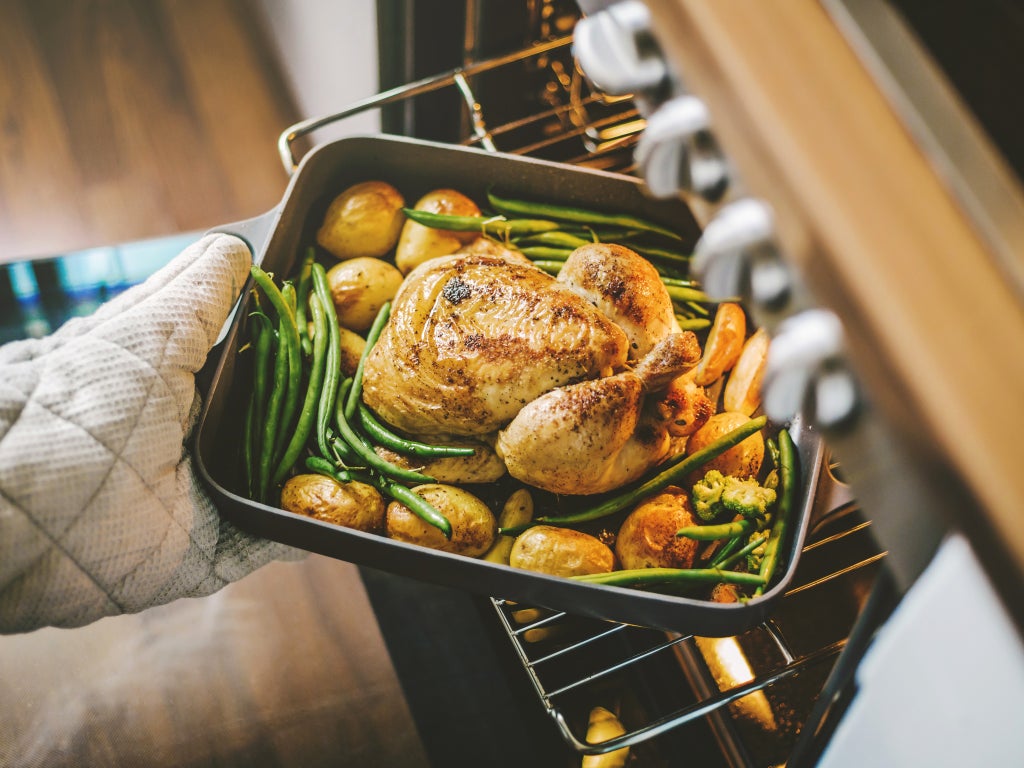 “Lamb or pork will take up much less room in the oven and you can slow-cook them. Whack them on for four hours and forget about them, which will leave you with plenty of time to get everything else ready. You can throw vegetables into the pan the meat is cooking in to roast, which will really simplify things.”