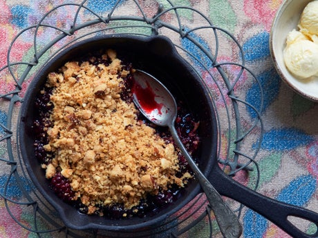 Turn off the heat. Sprinkle the nutty topping over the blackberries, breaking it up with your hands as you go. Serve topped with scoops of ice cream, if you wish.