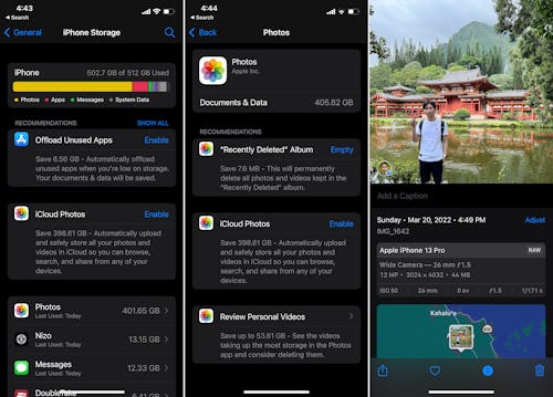 The first thing to clearing up your Photos app is knowing how much of your iPhone’s storage it’s eating up. In the Settings app, go to “General,” then “iPhone Storage.” If you shoot or save a lot of images like us, your Photos app will use up a ton. Ours uses up 405.82GB out of 512GB!