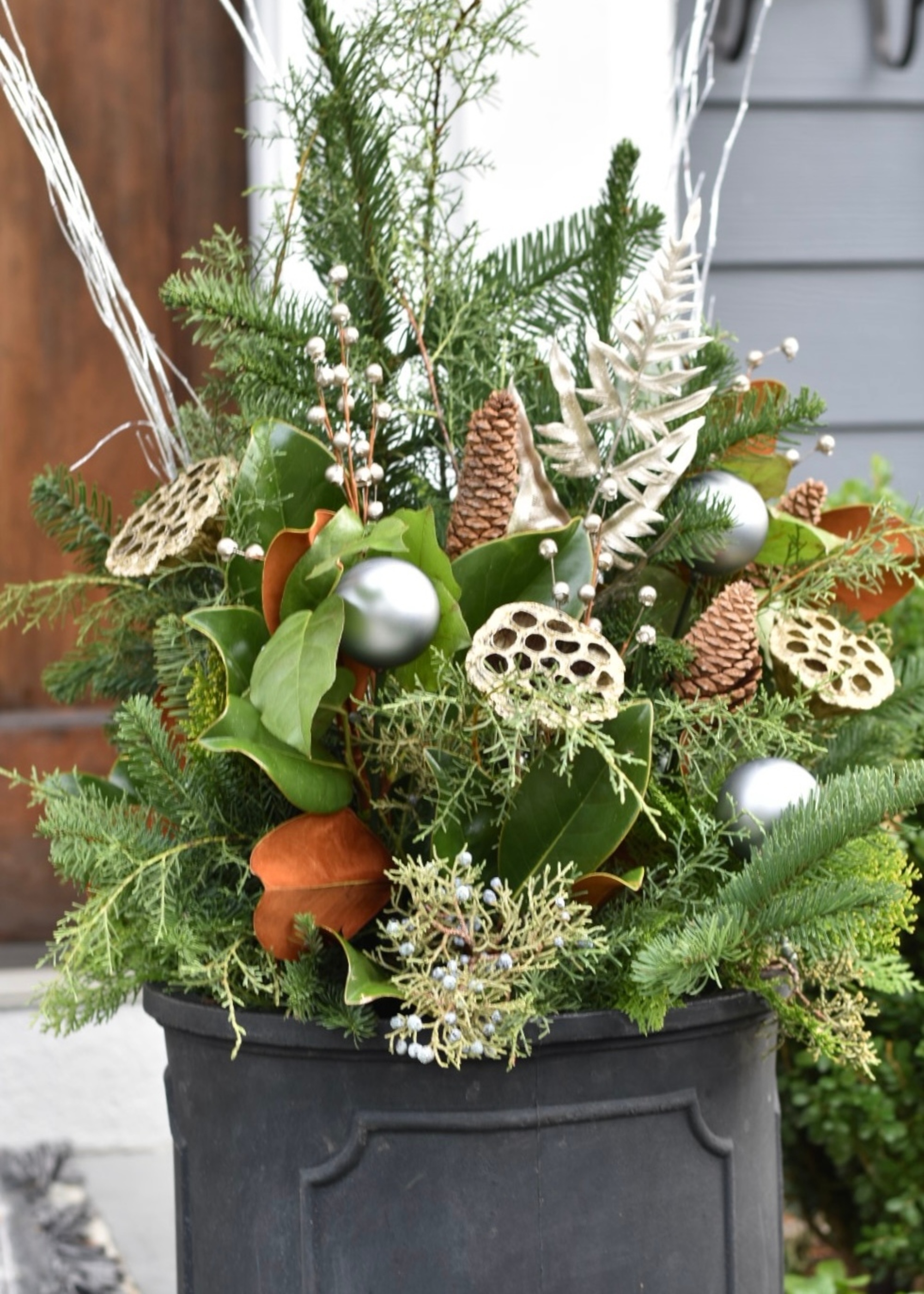 "I like to incorporate festive elements into my containers like lotus pods, pine cones, eucalyptus, or berries for a natural, yet colorful, festive look," says Laura Janney, CEO, The Inspired Garden Masterclass. "Alternatively, you can add some sparkle to your container by using seasonal picks (like ornaments) from your local craft store."