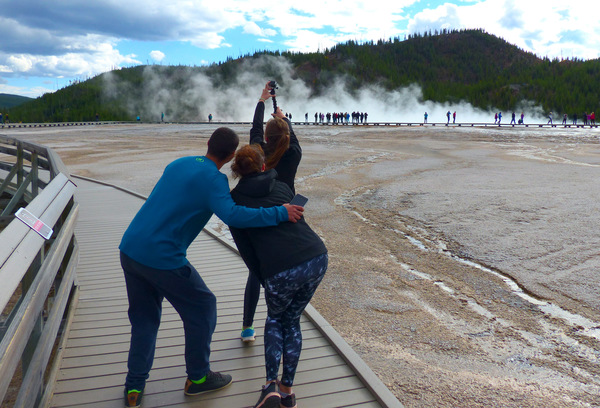 Was she glad to have come at this time of year I asked visitor Tammy Wright, a Seattle nurse who was threading a crowded boardwalk and ducking young parkgoers, who were wielding selfie sticks and speaking many different languages, at Grand Prismatic Spring. The thermal feature of eye-popping, bleeding colors has become one of the park's biggest attractions next to Old Faithful.