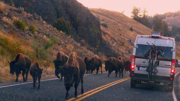 As happens so often here, traffic ahead halted when motorists spotted wildlife. But this was a little different. This herd of dozens of bison was walking on the two-lane highway, which like many roads in the park follows historic wildlife migration routes.