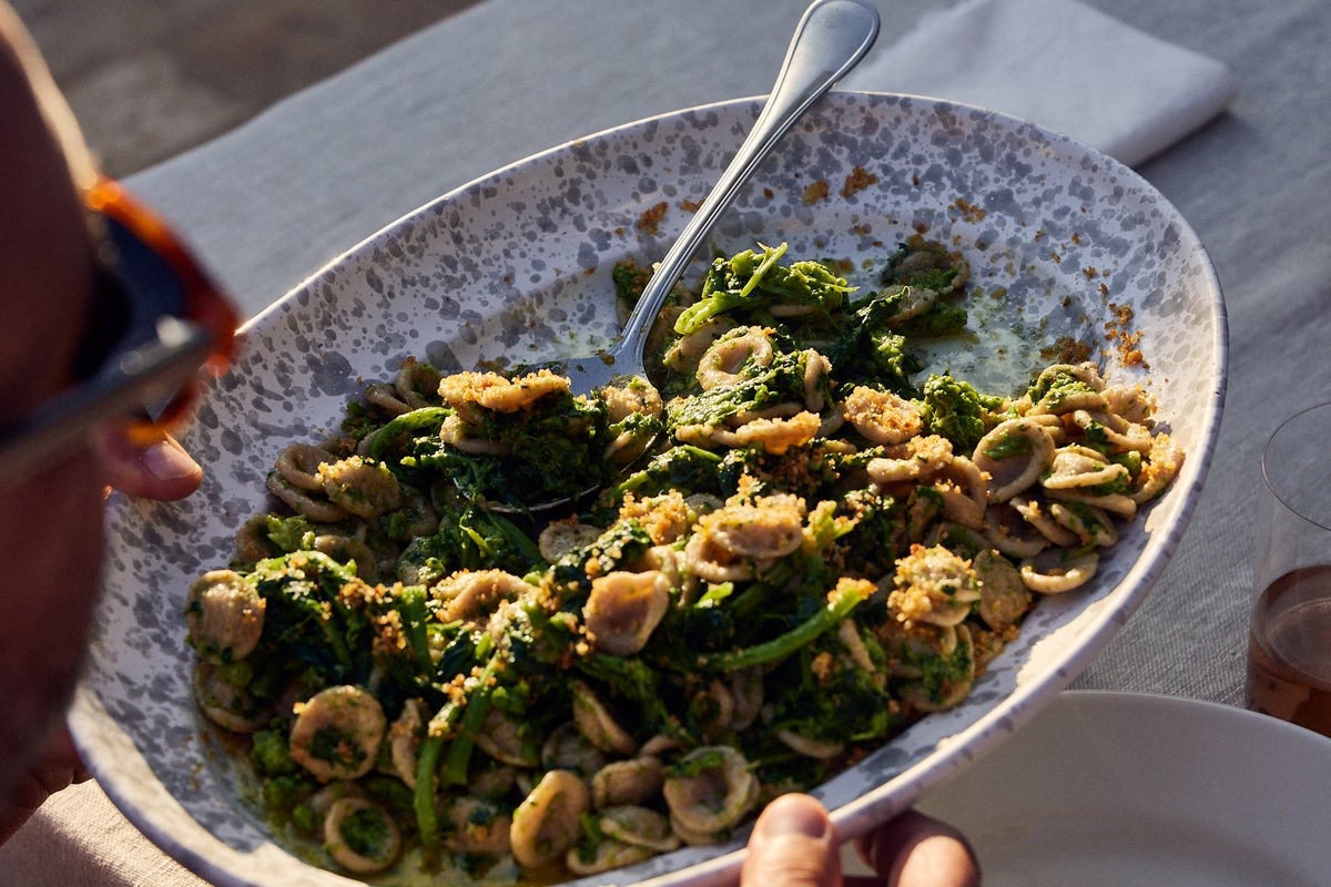 It is a dish that epitomises rustic and refined. Orecchiette pasta made with durum wheat semolina and water (no eggs), making it denser and chewy, contrasted with the slightly bitter earthiness of the cime di rapa, balanced with the richness of extra virgin olive oil, a little garlic, salty anchovies, which give umami for backbone and chilli flakes. A deeply satisfying plate of perfection. There are some regional variations within Puglia, such as the addition of toasted breadcrumbs and pecorino.