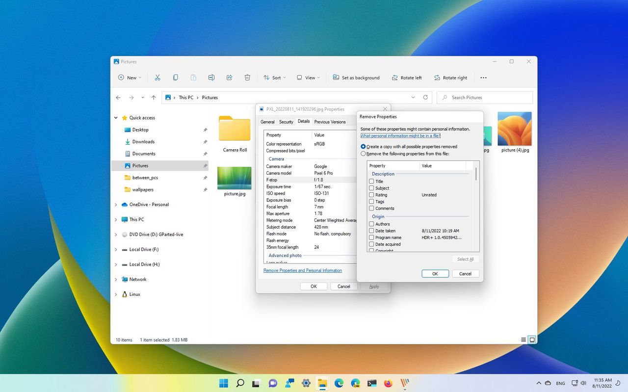 - On the Details tab of the picture, click the Remove Properties and Personal Information link.