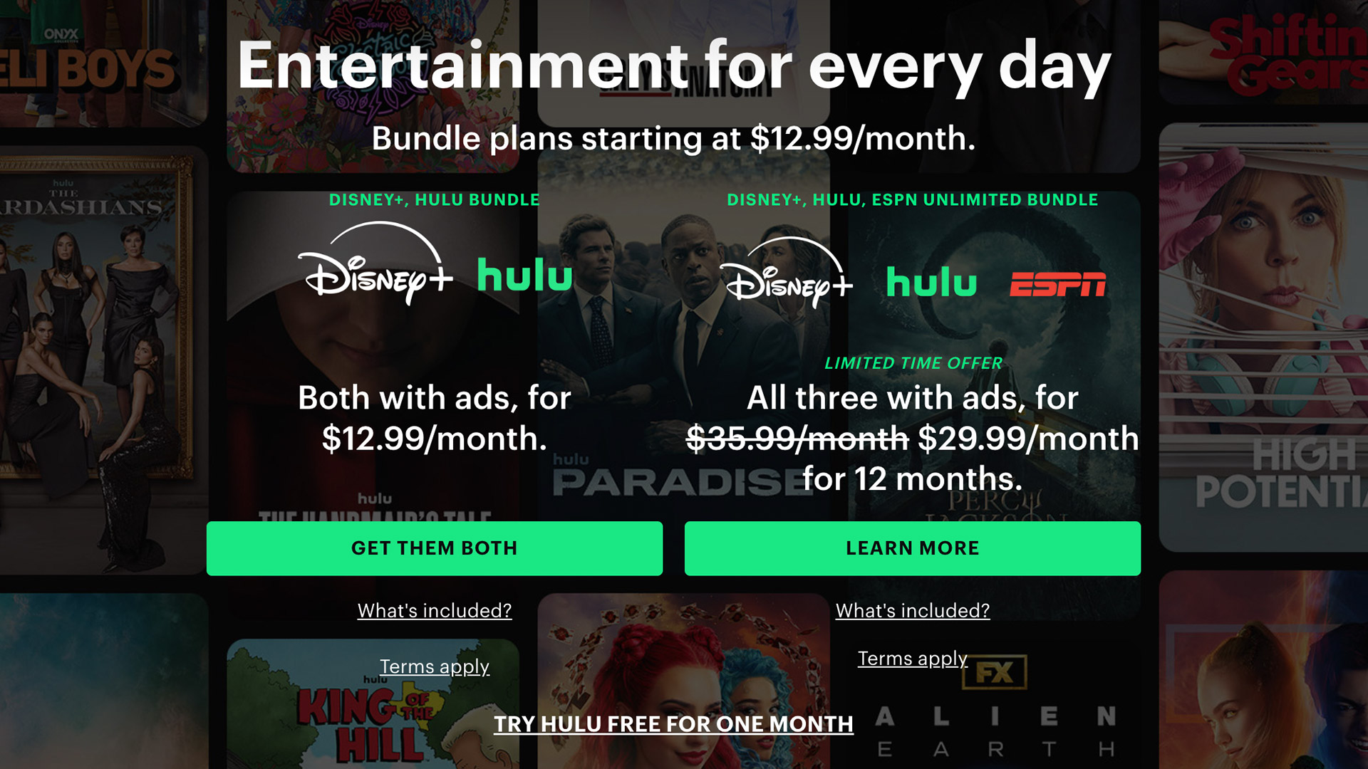 However, if you're after greater value for money, then signing up for one of the many bundles can be much more cost effective than getting separate subscriptions. The most popular is by far the Hulu and Disney+ bundle (details below), but the aforementioned Hulu, Disney+, and ESPN Select package also gets you access to three streaming platforms, all with extensive libraries, for a really great price of $19.99 a month.