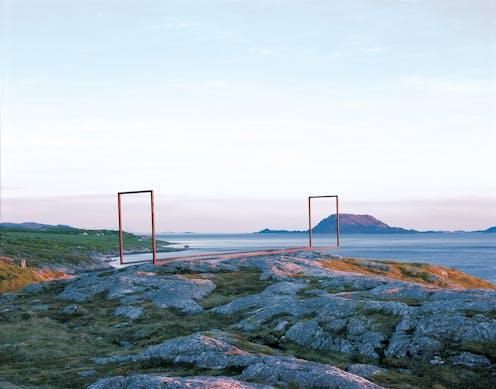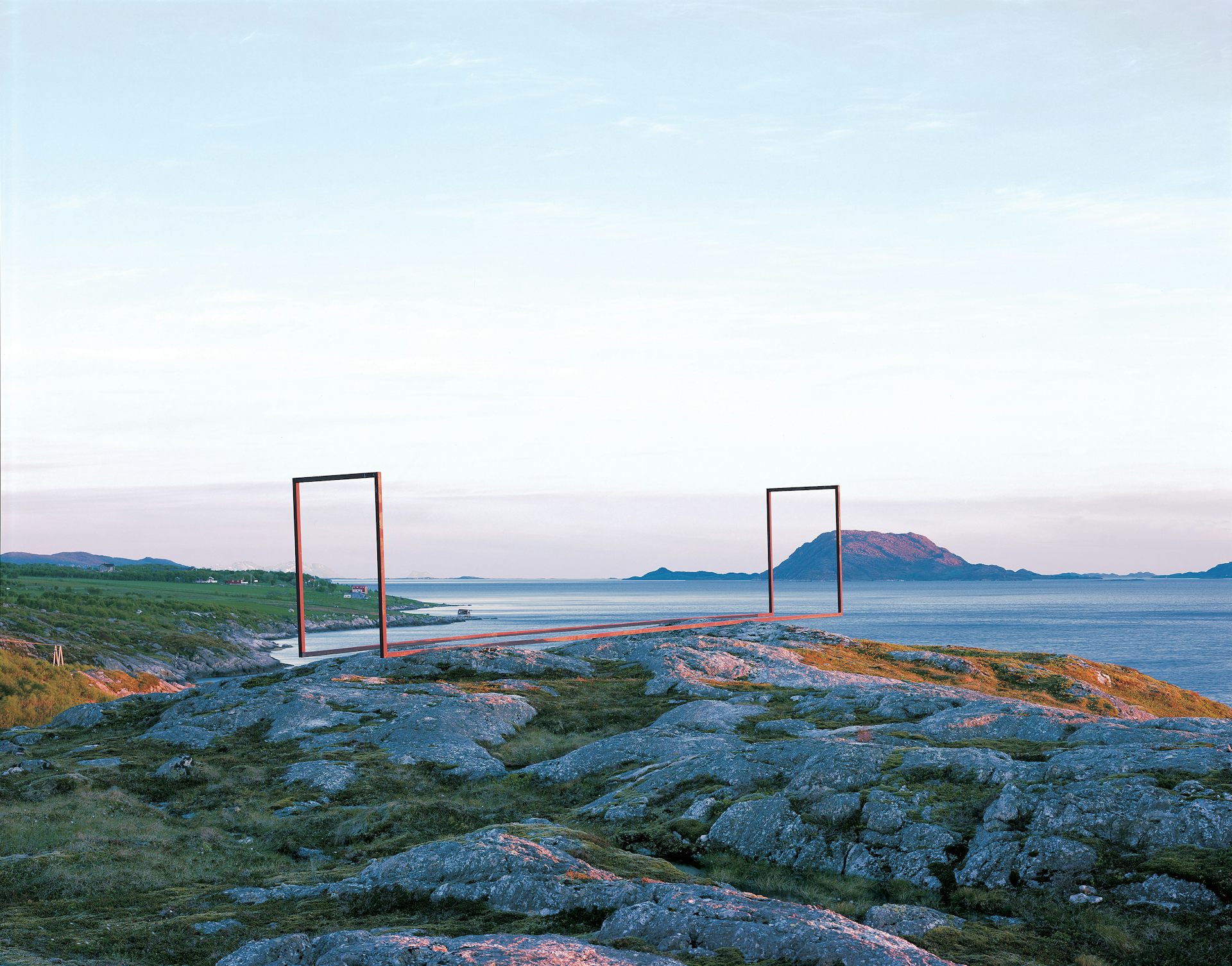 This “magic realist” idiom is only one of the languages deployed by the Nordland installations. Waltercio Caldas’s Around (1994) is a thoroughly stripped-down, rectilinear steel beam construction, a kind of large-scale minimalist viewfinder. The viewfinding theme recurs in Kristján Guðmundsson’s Protractus (1993), a granite arch by the side of a coastal road. Framing views of fjord, mountains and small communities on nearby promontories, it hints at a milestone.