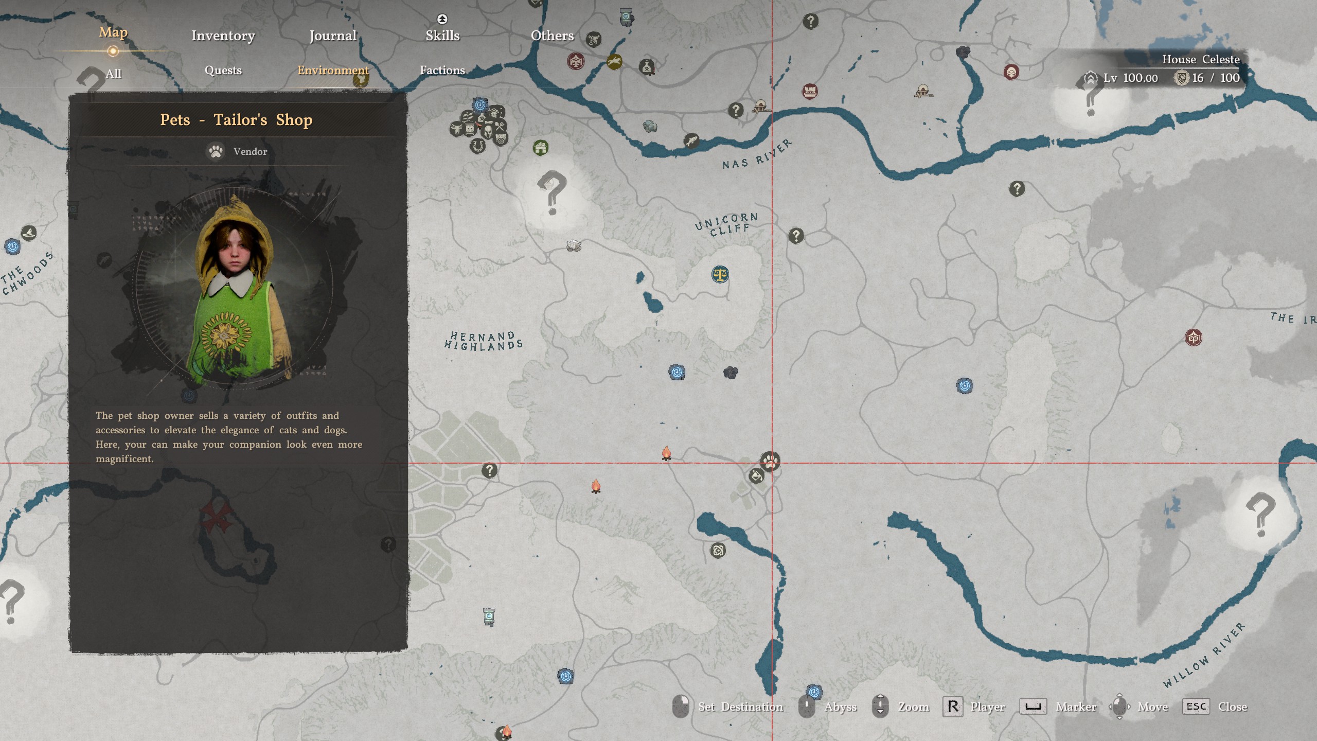 You can also buy armor for your pets in Crimson Desert. Once you unlock the ability to enter Florindale without getting sleep-darted by the forest guardians, you can find a pet tailor at the location above—presumably there are other pet tailors throughout the world, too, though I haven't found any yet. Once you've purchased your pet armor, you can equip it by: