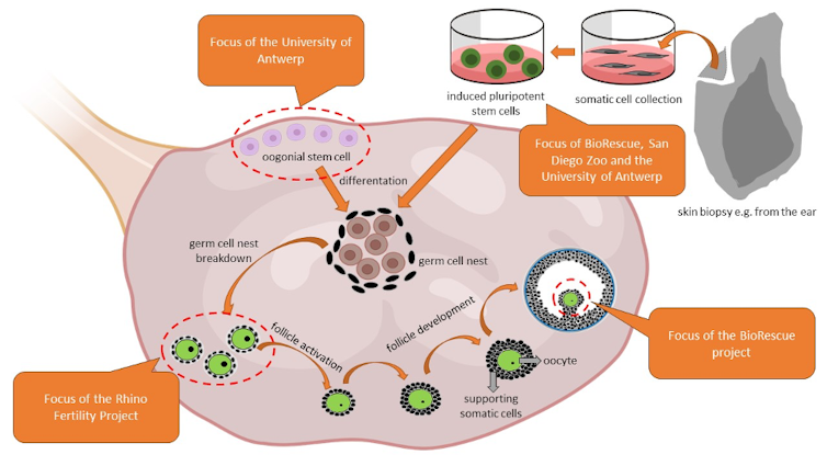 While BioRescue is collecting matured eggs after hormonal stimulation, the Rhino Fertility Project at the University of Oxford in the UK is focusing on growing follicles, which are structures found in the ovary containing an immature egg surrounded by a few layers of supporting cells. These supporting cells provide signals and components essential for the development of the eggs. The idea is to make use of the much greater potential of the ovary by collecting the very small follicles and growing them all in a petridish in the lab.