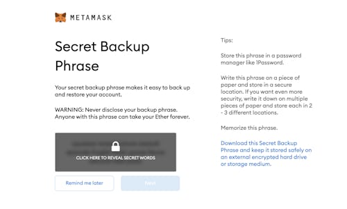 Once the extension is installed, you’ll be prompted to sign in to an existing account or create a new wallet. If you’re starting a new account, you’ll be asked to generate a password for your account. Then you’ll be given a unique 12-word Secret Recovery Phrase — this phrase serves as a master password that can access MetaMask and subsequent accounts. MetaMask recommends a few ways to keep your Secret Recovery Phrase safe, including storing it in a secure password manager, writing it down in multiple secret places, or keeping a printed copy in a safety deposit box (act accordingly based on how much you have invested in your wallet).