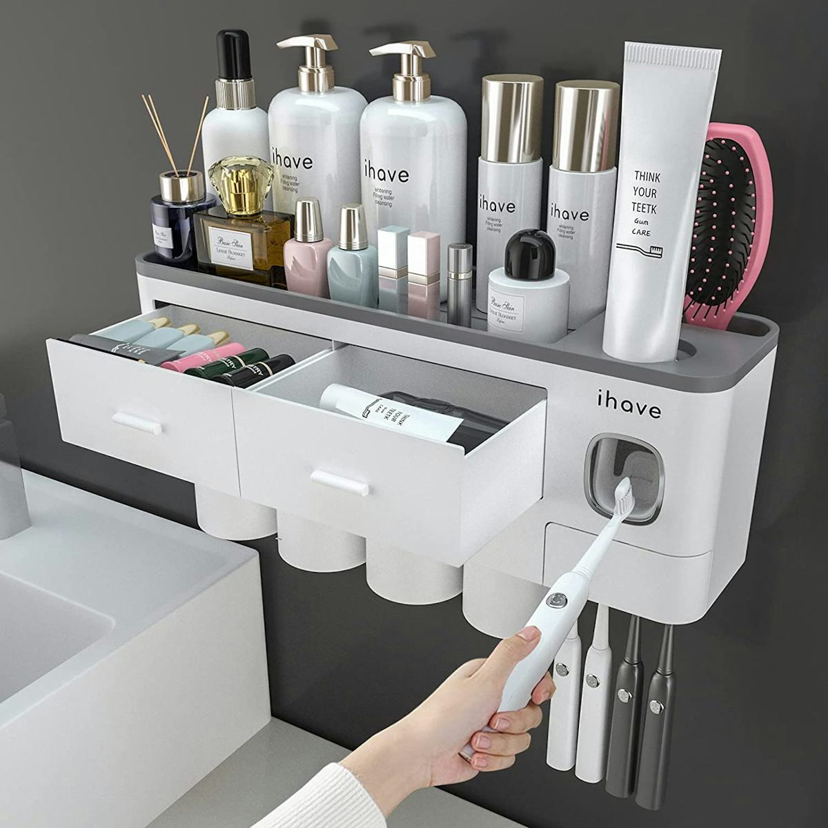 This wall-mounted holder has spots to hang up to seven toothbrushes (and there’s a built-in paste dispenser), plus there are various other storage compartments, including two pull-out drawers. This way, you can clear these items from your counters for a less-cluttered look. The version shown has four removable rinse cups but two- and three-cup versions can also be found in the listing.
