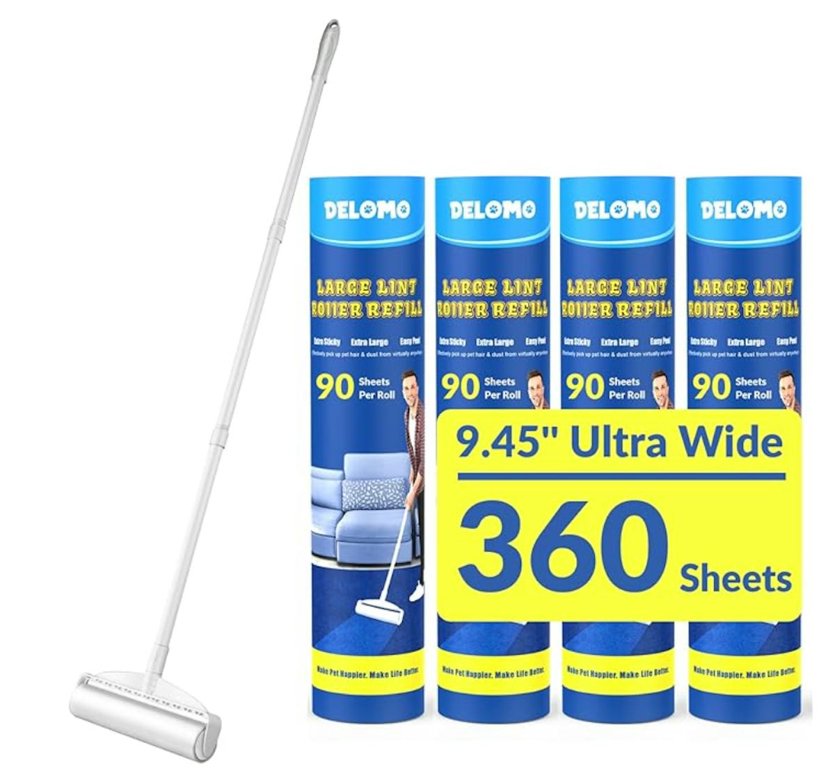 Get pet hair, crumbs, and other messes off of various surfaces (including carpets and hard flooring) with this lint roller that has an adjustable length, reaching up to 45 inches. The large lint roller head is sticky, and each roller head has 360 sheets to last a while. Four extra rollers are included.