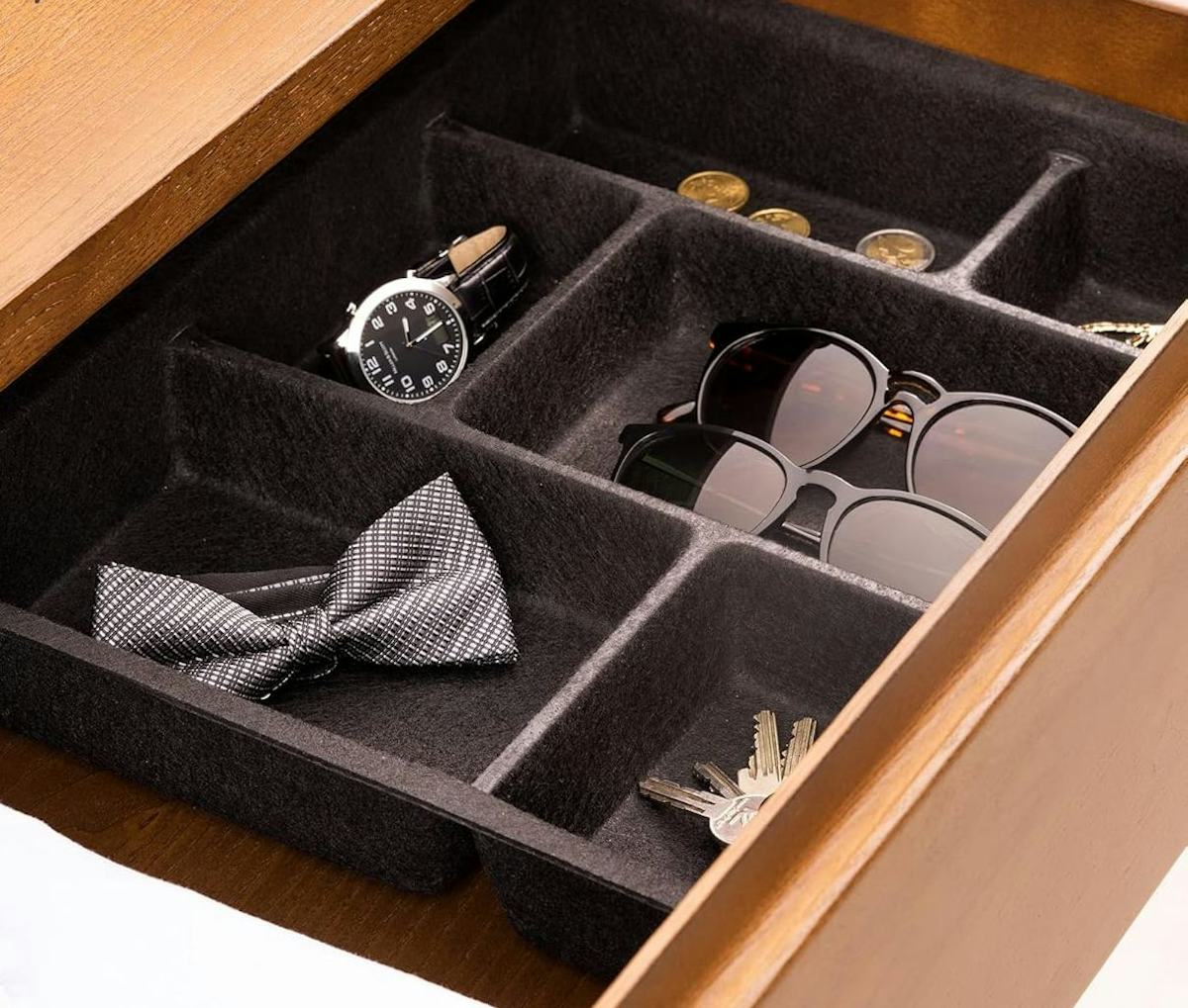 Amazon -This felt tray can be used to organize jewelry at your vanity, odds and ends in your junk drawer, supplies at your desk, makeup in your bathroom, and more. Choose from black or gray colors in the listing.
