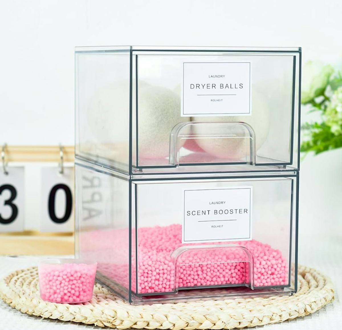 Create a more organized laundry room with these clear bins. They’re well sized for laundry pods, dryer sheets, scent beads, and other laundering essentials, and the included labels allow you to keep the contents straight. The bins stack to save space.