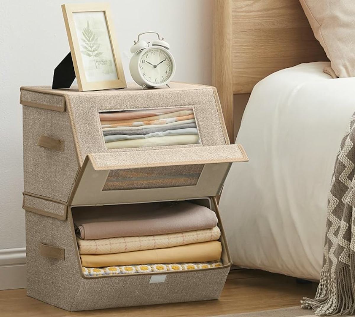These two storage bins are designed to stack on one another, taking advantage of vertical space wherever you choose to use them. Each one has a nonwoven fabric surface with a transparent window that makes it simple to view the contents inside. Conveniently, the lid is located on the front for access.