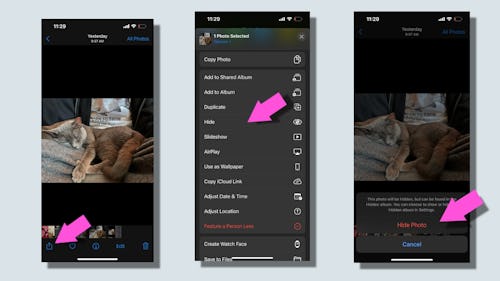 - Once you’ve carefully scrolled past your options, tap “Hide” and a pop-up will appear asking you if you want to “Hide Photo.” Tap that button and boom.