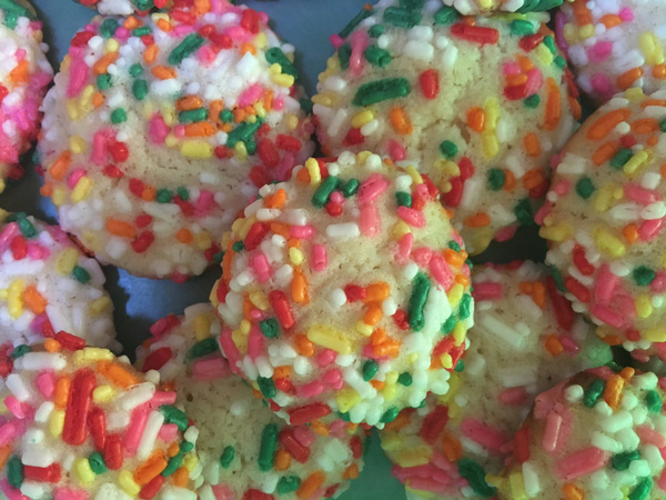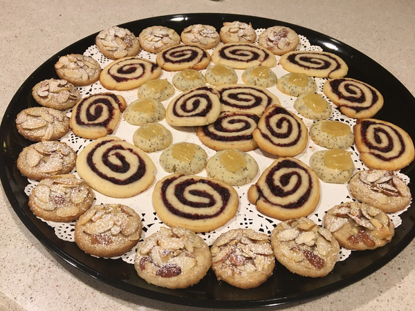 The refrigerator is your friend with this recipe, I discovered. The basic dough freezes well, though it will take a while to defrost. Chilling at least in the fridge is a must, but some of the varieties will work with as little as 30 minutes of chill time. Anything rolled and cut out, or rolled in coatings, will need at least 60 minutes. The swirl cookies require slightly chilled dough before the filling is added, and then the whole thing is wrapped and frozen (but these can be cut fairly soon after being removed from the freezer).