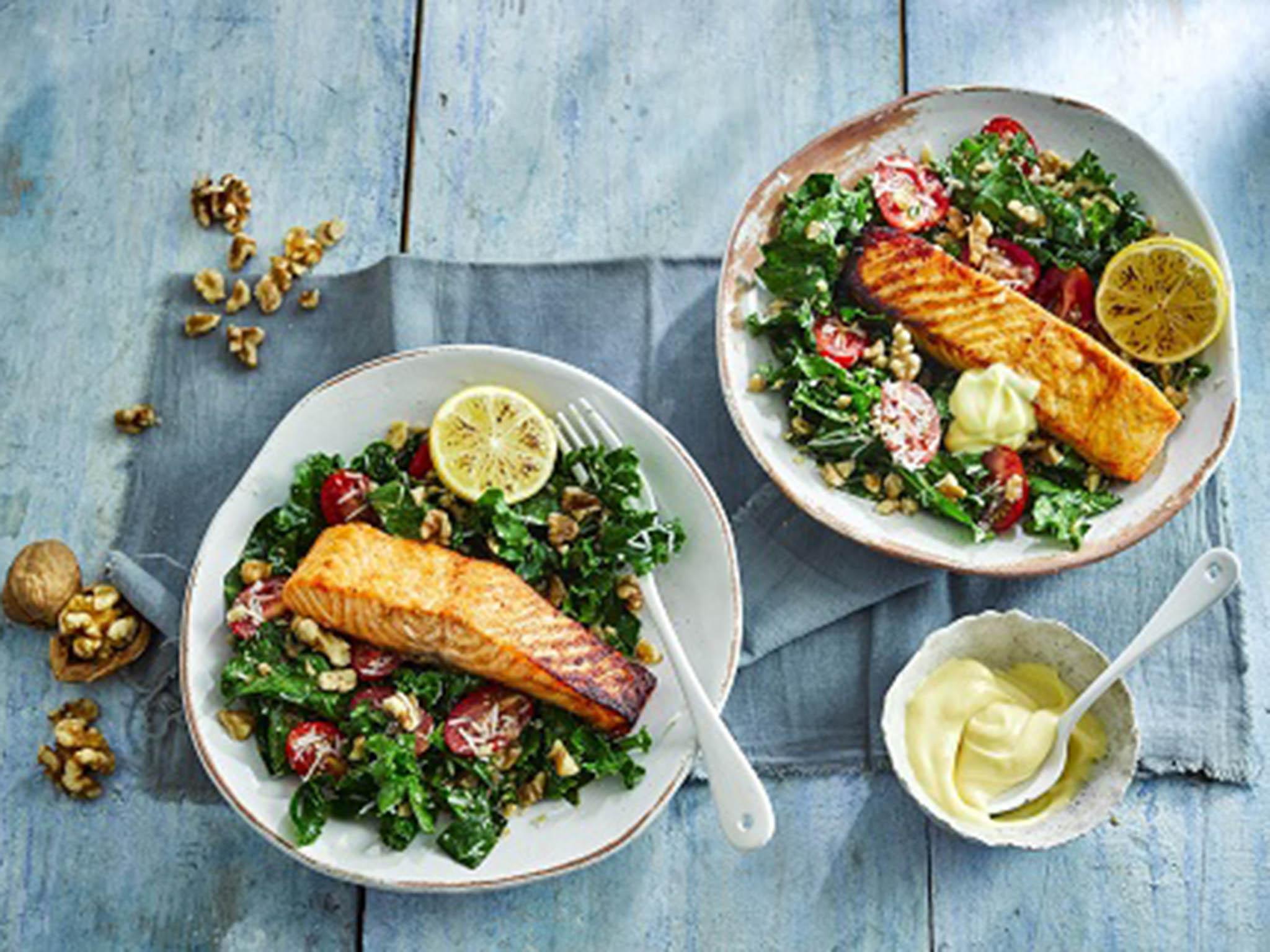 While the salmon is grilling, toss the walnuts, tomatoes and parmesan together and add to the dressed kale, then stir the walnut oil and anchovy dressing through the salad.