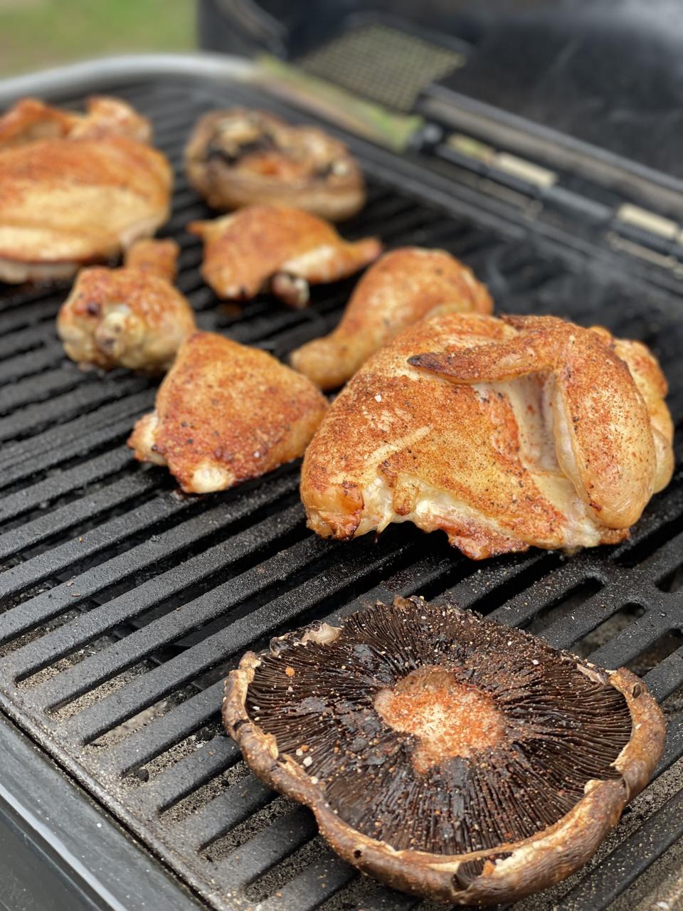 I grilled the chicken pieces for about 20 minutes and then added Portobello mushroom caps to the cooking grate that were also seasoned with the barbecue rub. These were “barbecue” for my vegetarian friends, but if you love mushrooms, you should make them as a side to the chicken because they are as good as the chicken!