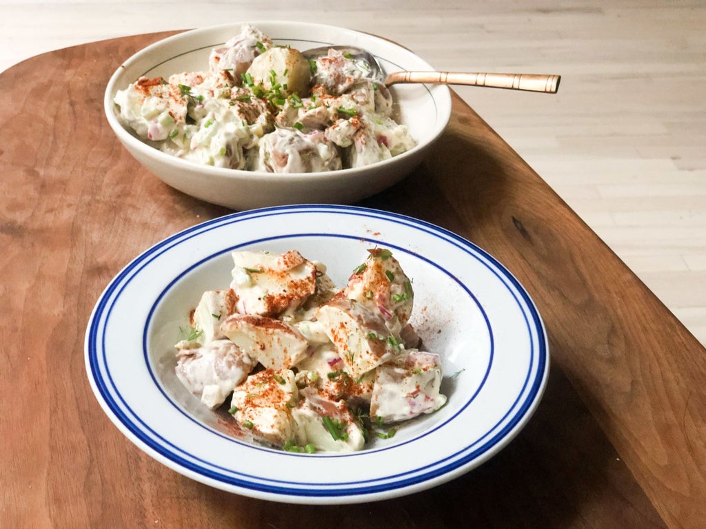 “Chilling helps the texture and set and evaporates some of the moisture,” says Freeman. “If you add dressing before they’re cool, they can get too soft. Then you’re stuck with mashed potato salad. I don’t know who wants that.”