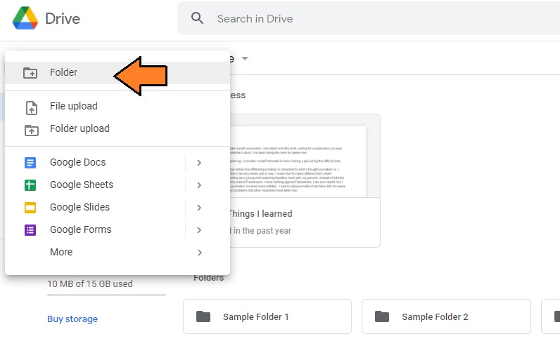 To make a new folder, click on the "+ New" button at the upper-left corner and hit "Folder". Note the option to create new documents and other files in the menu as well. Google has set it up so you can access the tools you need right from this page.