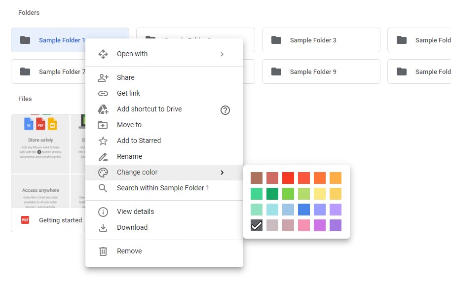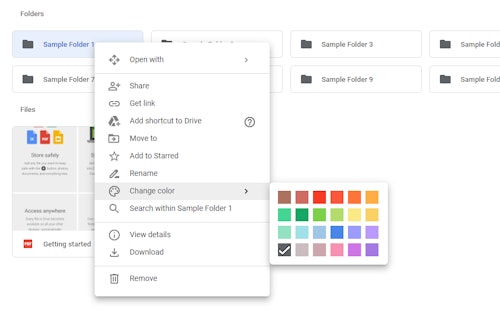 Start by right-clicking on a folder. When a menu shows up, hover over the "Change color" option to pop up a palette of colors. Choose whichever one you'd like.