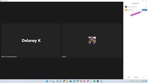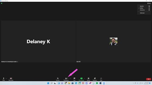 - Once your meeting has started and at least one other participant has joined, click on the “Participants” button on the left-hand side of the Zoom toolbar.