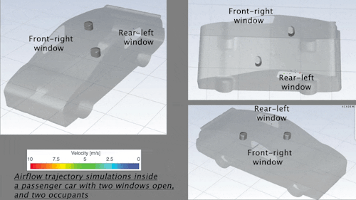 What we found out from computer simulations is that the air enters through the rear window, turns around behind the rear passenger and exits through the front window. This way, many of these aerosol particles inside the cabin can be flushed out.