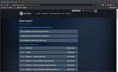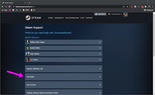 - Click on “Purchases” in the menu below. You can also click directly on the title of the game you’d like to return if it shows up under the “Recent Products” header.