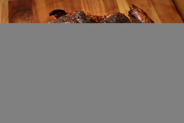 The first thing you want to do is spatchcock (oh, stop snickering; what are we, 12?) the bird. Prop it up on the cutting board on its tail, as if it were reading a book. Use your chef's knife to remove the backbone. This process can rightly be described as grizzly because it involves cutting through the ribs with an unfortunate and possibly disturbing crunching sound. Fear not, though, as the bird, having previously expired, will feel none of this. Any discomfort is yours alone to bear.