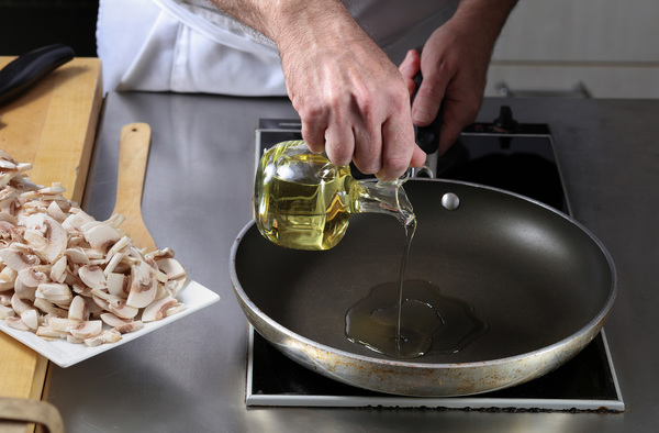 3. Spread your mushrooms evenly over the bottom of the pan, no more than two layers deep, like an "SNL" after-party. In other words: Don't overcrowd the pan. Here's why: Cold mushrooms cool down your hot pan, causing them to sweat instead of saute.