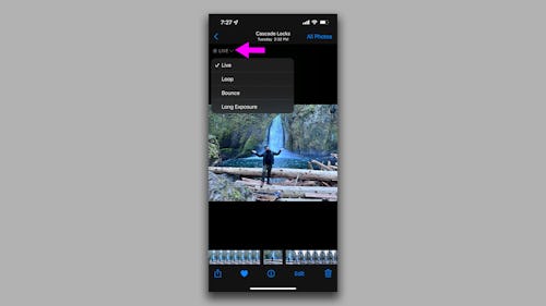 - Tap that “Live” label to open up a dropdown menu. There are two options for GIFs: “Loop” and “Bounce.” Choosing “Loop” will simply loop the short video portion of the Live Photo. Instead of jumping back to the start of the video though, there’s a light fade that makes it a bit of an awkward choice for shorter loops. “Bounce” plays the video clip, then reverses it, (and repeats forever), delivering that “boomerang” effect that homemade GIFs usually have. Check out the differences between the two below in this “Look, I’m somewhere outside” pose Live Photo.