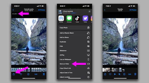 - In your camera roll, find a Live Photo that you’d like to save as a video. Live Photos will be indicated by a circular symbol and the word “Live” in the upper left-hand corner of the screen when you have a single photo selected.