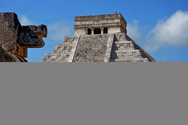 The pyramid's sharp angles and imposing symmetry set off a cloudless blue sky. Steep staircases on all four sides culminate at a temple, perched like a crown. The Mayans included a step for each day of the year; each side has 91 and the temple counts as the 365th. Fantastical sculptures of feathered serpents run down its sides, representing the god Kukulcan, a name derived from the words for feather and snake.