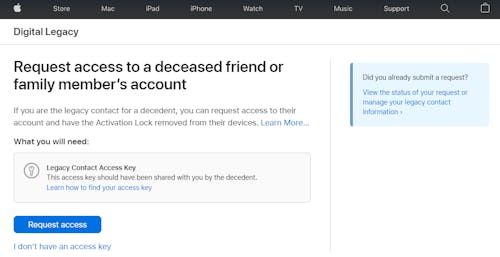 To request access to an account, visit this Apple page and have your access key in hand. You may be asked some additional personal questions about the contact (you’ll need their date of birth) and you’ll be asked to enter the access key, either by entering the code manually or scanning the QR code with two mobile devices.