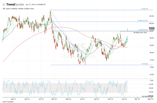 As for Morgan Stanley stock, the shares are trading much better this morning. The stock is clearing the fourth-quarter and December high, as well as the 61.8% retracement from the 52-week low up to the 52-week high.