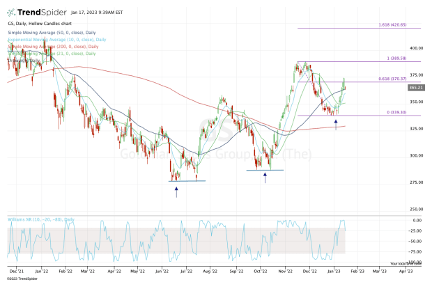 On the long side, let’s see if Goldman Sachs stock can hold $350, then reclaim the 10-day and 50-day moving averages. If it can, bulls will want to see it regain the 61.8% near $370, then rotate over last week’s high near $375. Above $378 puts $390 in play.