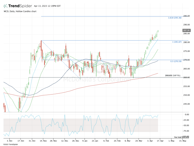 This morning would have been a great opportunity for active traders had McDonald’s pulled back into the low-$280s. Not only would that have allowed for a retest of the prior all-time high at $281.67, but also for a test of short-term support via the 10-day moving average.