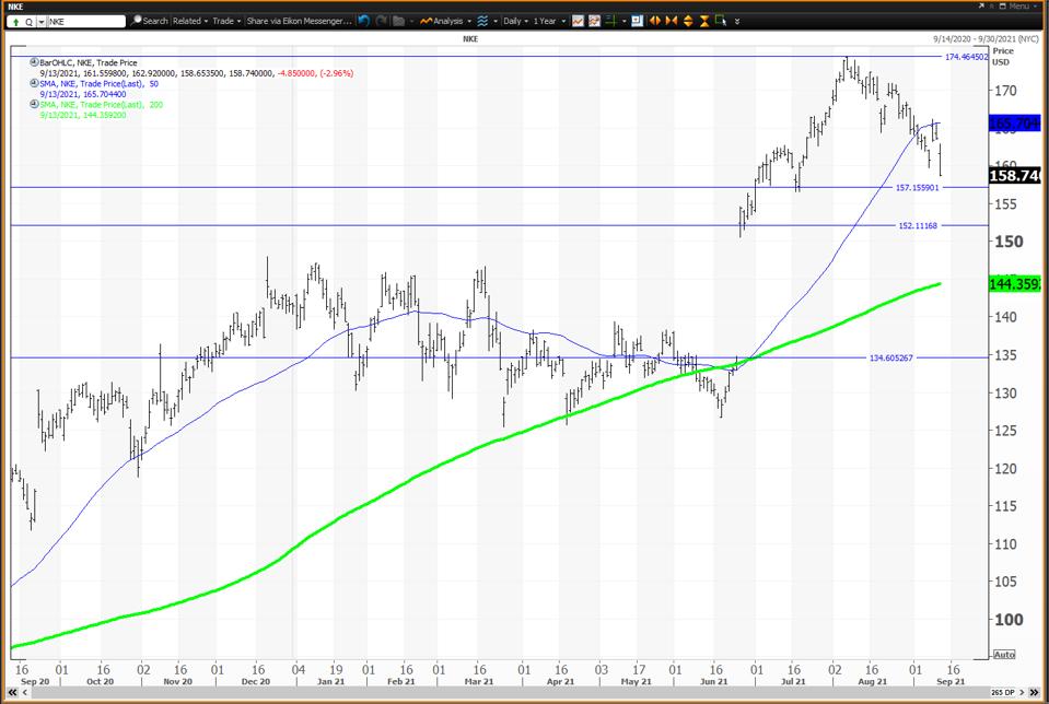 Trading Strategy: Buy Nike on weakness to its quarterly and semiannual value levels at $157.14 and $152.14. Reduce holdings on strength to its 50-day simple moving average at $165.70.