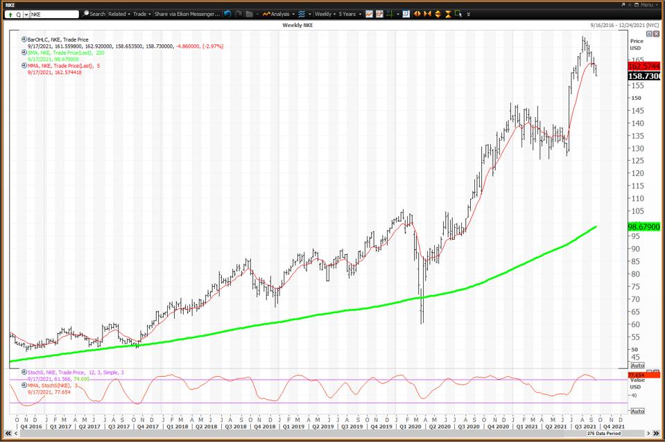 The weekly chart for Nike ended last week negative. The stock is below its five-week modified moving average at $162.60. The stock is well above its 200-week simple moving average or reversion to the mean at $98.68. The 12x3x3 weekly slow stochastic reading is declining at 77.72, moving below the overbought boundary of 80.00.